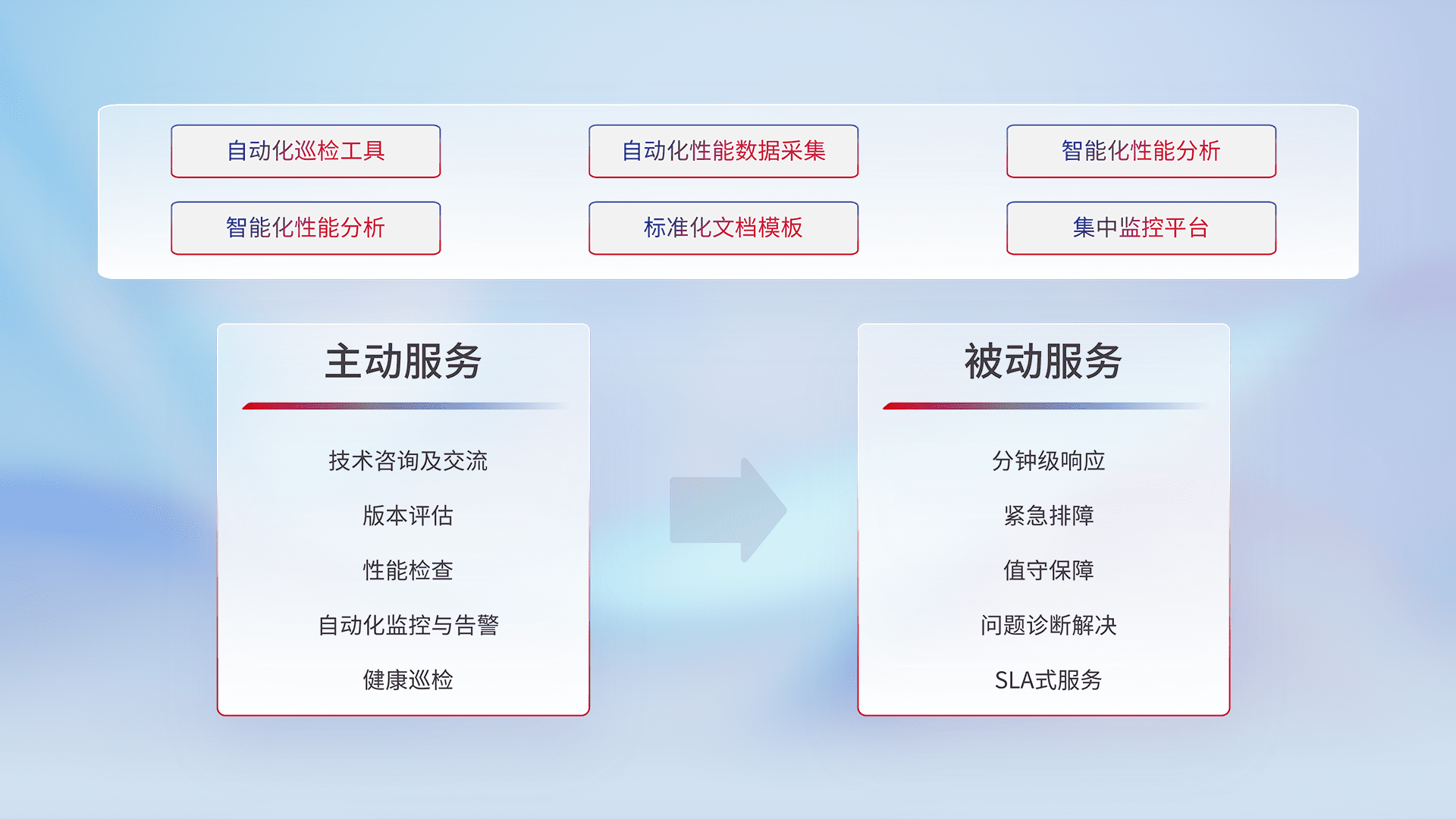 智能化工具和标准化文档,,,保障服务质量,,提供主动服务(包含技术咨询、、、、版本评估、、、、性能检查、、、、自动化监控与告警、、、、健康巡检)和被动服务包含(分钟级响应、、、、紧急排障、、、值守保障、、问题诊断解决、、、SLA服务)。。。
